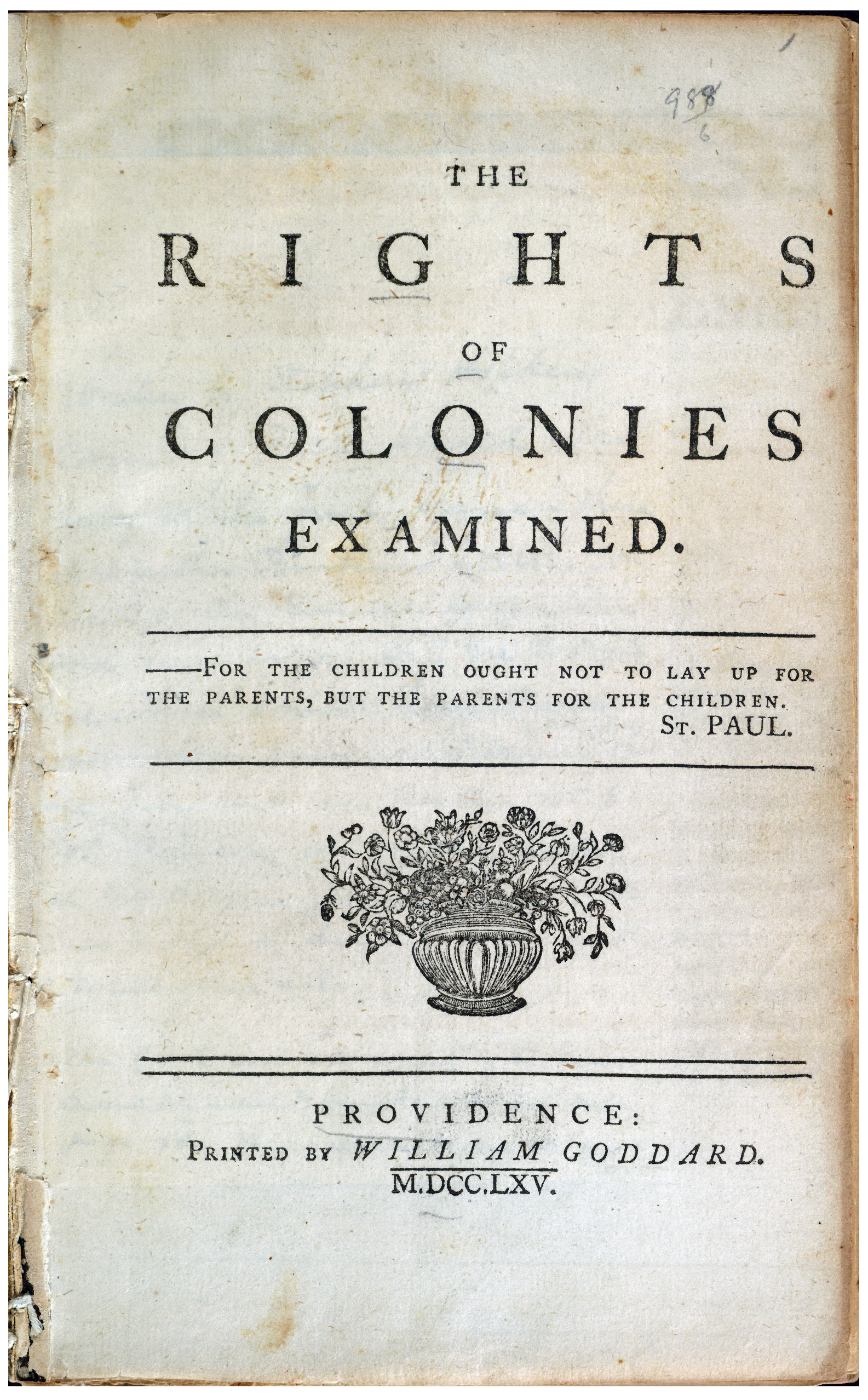 Stephen Hopkins, The Rights of Colonies Examined, 1765, a germinal text in the struggle for American independence. Brown University Library.
