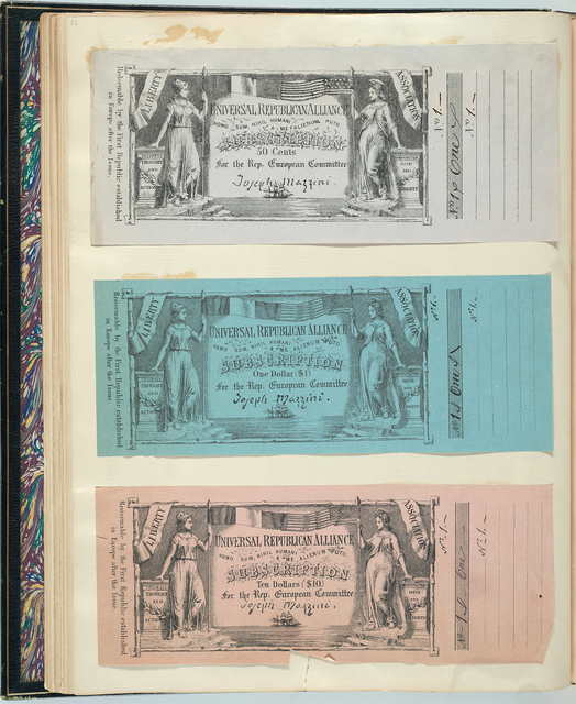 Three printed subscription notes for the Republican European Committee of the Universal Republican Alliance in the amounts of 50 cents, $1, and $10. Contain signature of "Joseph Mazzini." Note that the funds are "redeemable by the First Republic established in Europe after the Issue." John Hay Library, Brown University.