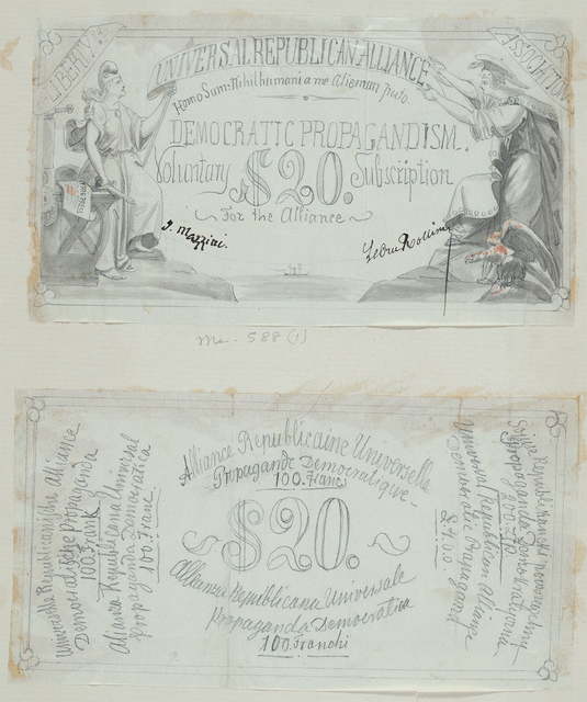 two hand-drawn designs for $20 subscription certificates to raise money for the Universal Republican Alliance